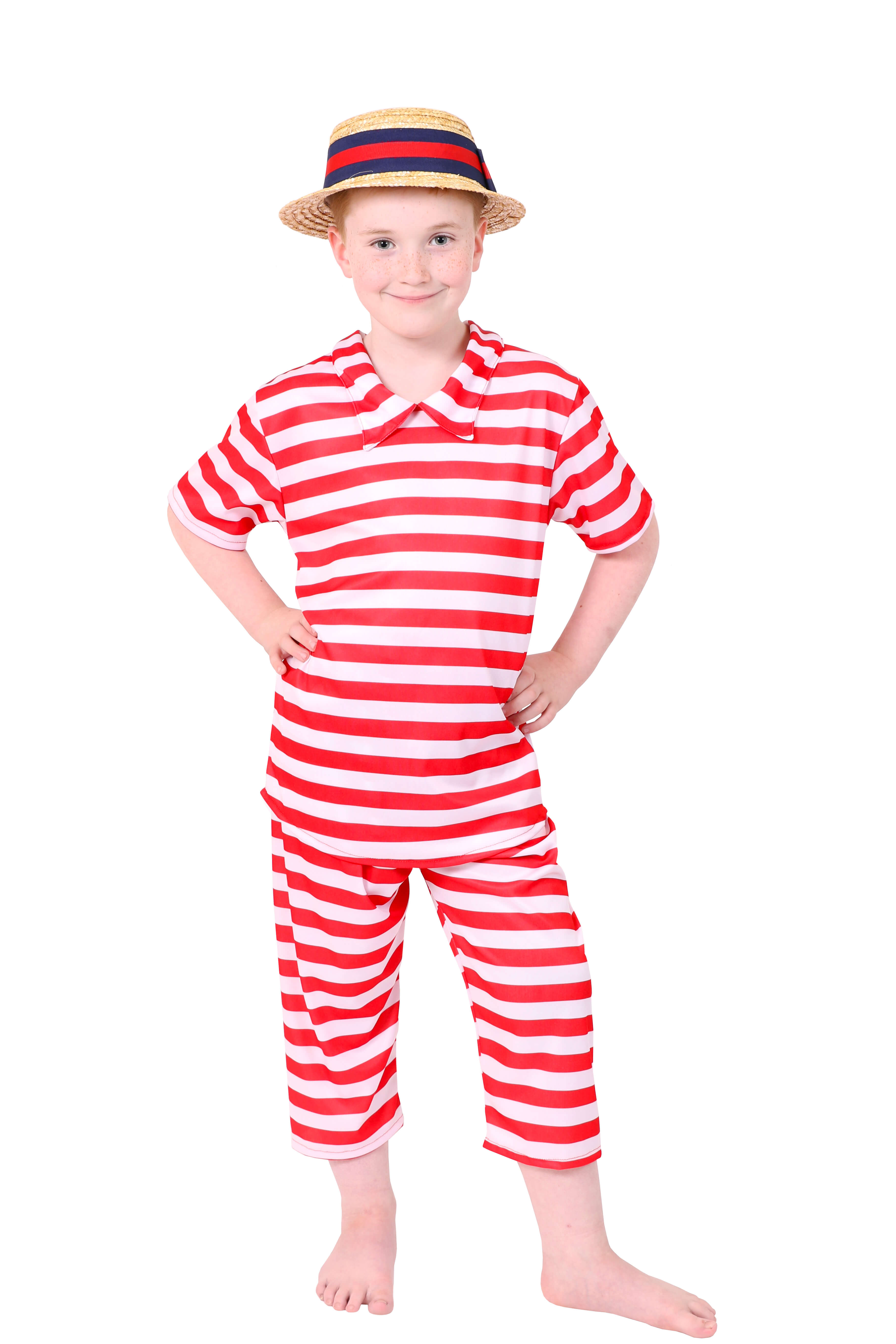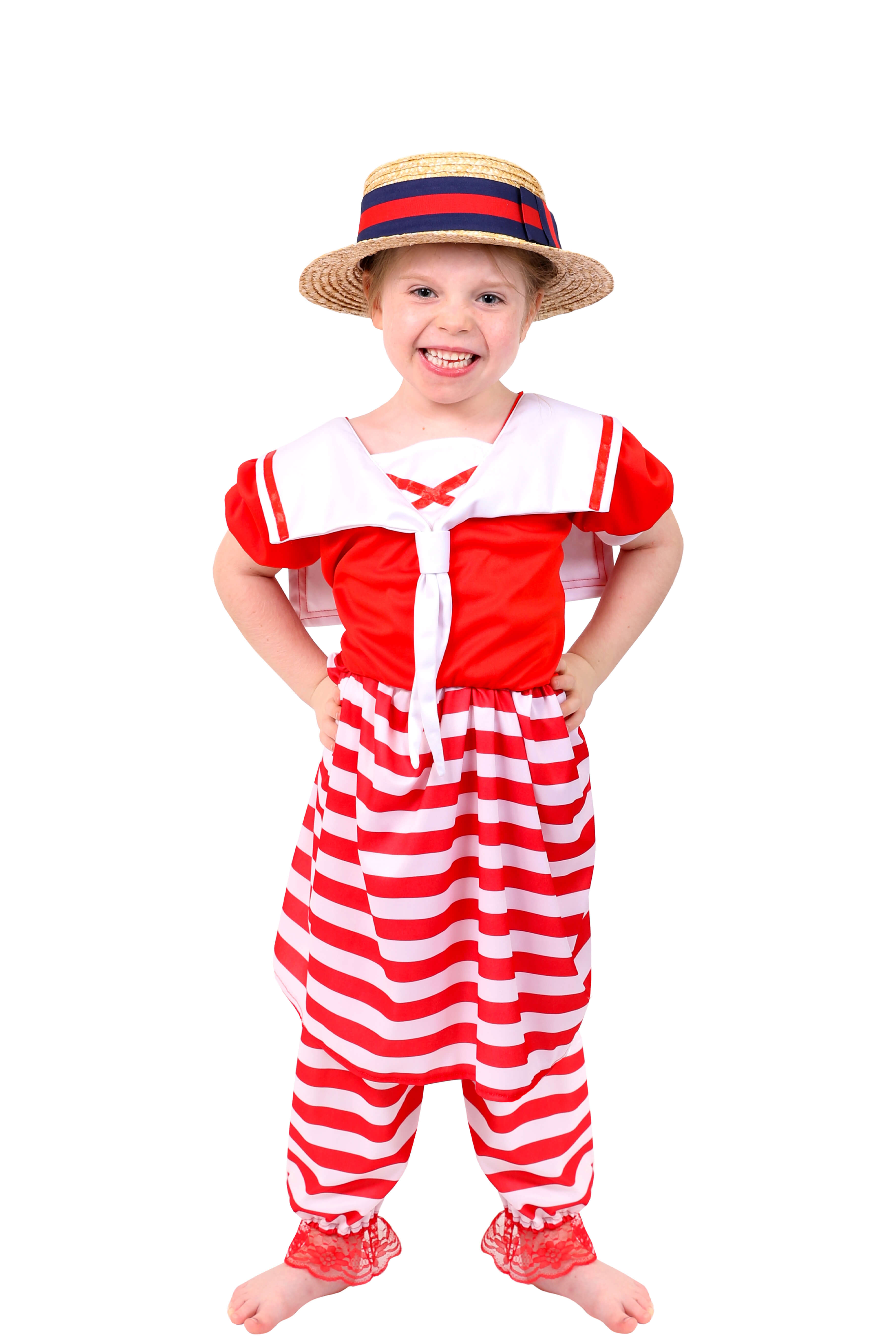 Take a swim back in time and get your dose of vitamin-sea in this Girl's old-time bathing suit! Say Shell-Yeah! and complete your Victorian look with a quality straw boater!